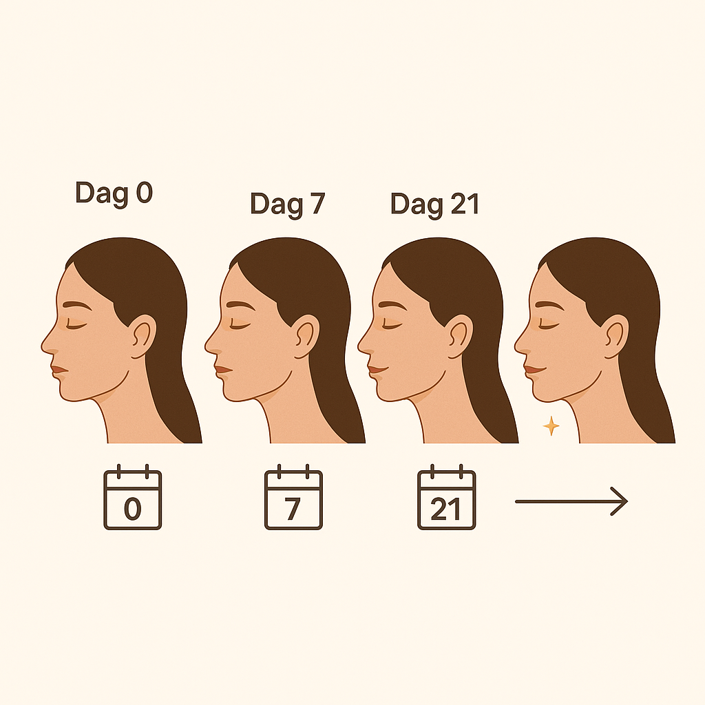 - Dag 0: Første behandling – huden føles straks renere og mere fugtet.